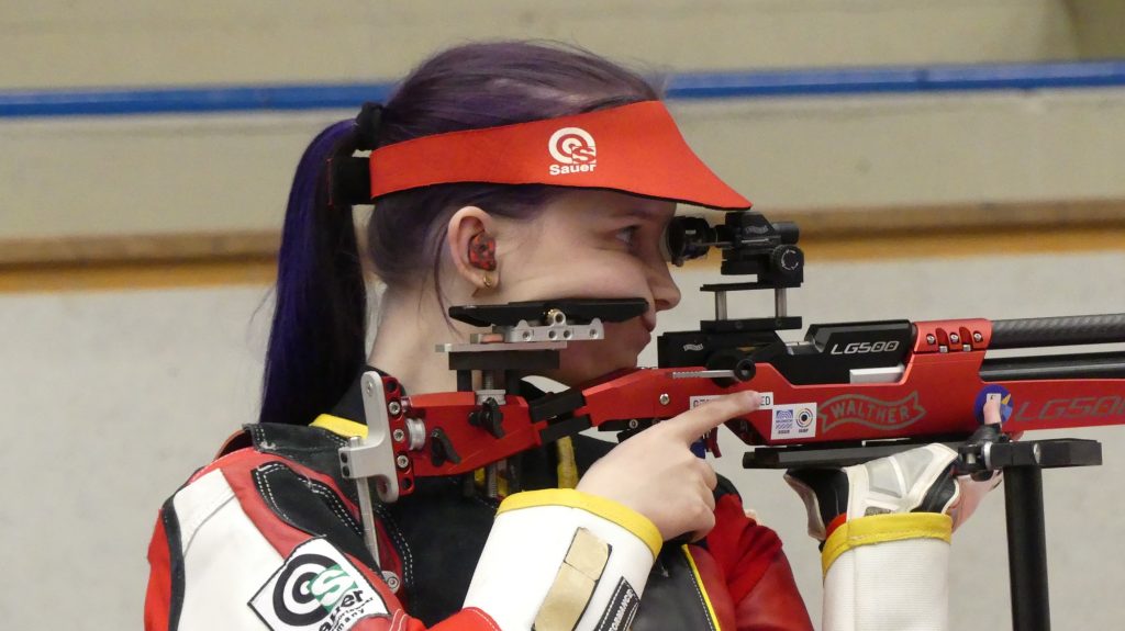 Am Sonntagmittag kam es dann zu der wichtigen Begegnung gegen Eichenlaub Saltendorf. Von Beginn an waren die Gäste im Vorteil und nach 15 Minuten zeigte die Hochrechnung ein 2:1 für Saltendorf. Larissa Wegner hatte Probleme mit einer Treffpunktverlagerung und daraus resultierend zwei 9,9. Auch Lana Wurster unterlief zu Beginn eine schlechte Neun. Danach zeigte die Hochrechnung auf der Anzeigentafel ein 3:2 und dann sogar eine 4:1 für Saltendorf. Zu diesem Zeitpunkt konnte nur Max Braun seinen Punkt behaupten. Dem Schluss zu zeigten jedoch die Saltendorfer Schützinnen und Schützen etwas Nerven. Auf Position eins erreichte Vanessa Gleißner in ihrer vierten Serie nur 97 Ringe und schoss sogar mit dem letzten Schuss eine Neun. Auf Kronauer Seite konterte Larissa Wegner mit 100 Ringen und sicherte Kronau den Einzelpunkt. Die Gegnerin von Max Braun schoss im letzten Schuss ebenfalls eine 9. Max Braun musste danach zwar noch mit einer Zehn ausschießen, was er auch routiniert tat und seinen Punkt sicherte. Annabelle Lotter und Nele Stark, trotz hervorragender 397 Ringe, verloren ihre Matches. So zeigte die Hochrechnung kurz vor Schluss ein 3:2 für Kronau. Doch Lana Wurster hatte noch 10 Schüsse zu absolvieren. Nach je einem Neuner, beim 34. und 39. Schuss, schrumpfte ihr Vorsprung auf einen Ring zusammen. Für den Sieg musste sie jetzt einen Zehner schießen. Sie stand wieder ganz alleine am Schießstand und wieder waren alle Blicke auf sie gerichtet. Nach mehrfachem Absetzen dann der erlösende Schuss und Lana Wurster war wieder die umjubelte Schützin beim 3:2 Endstand für den SSV Kronau.