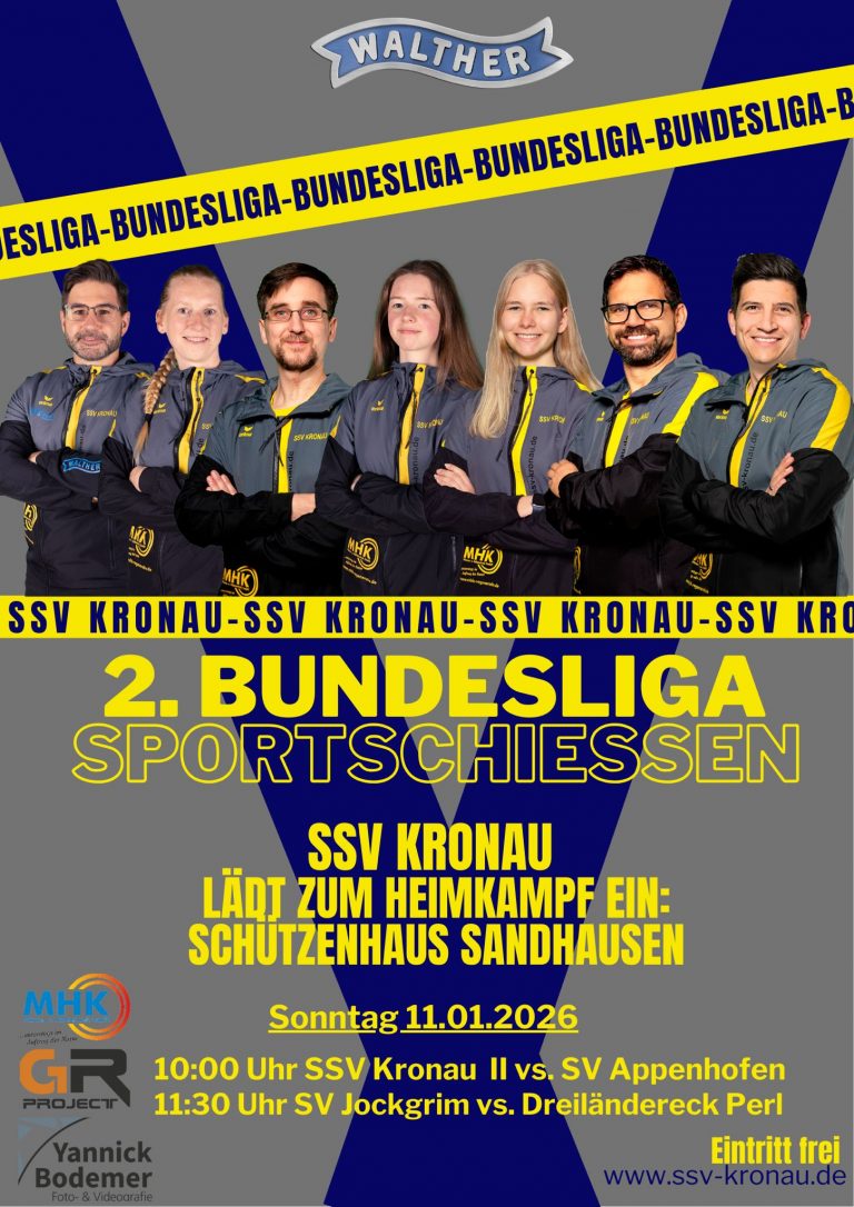 Der SSV Kronau bestreitet am 11.01.2025 seinen Heimwettkampf der 2. Mannschaft in der 2. Bundesliga Süd-West beim Schützenverein in Sandhausen und lädt hierzu Interessierte und Freunde des Schießsport recht herzlich ein.